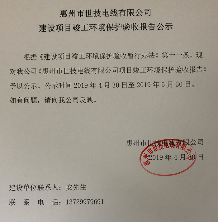 惠州市世技電線有限公司建設(shè)項目竣工環(huán)境保護驗收報告公示
