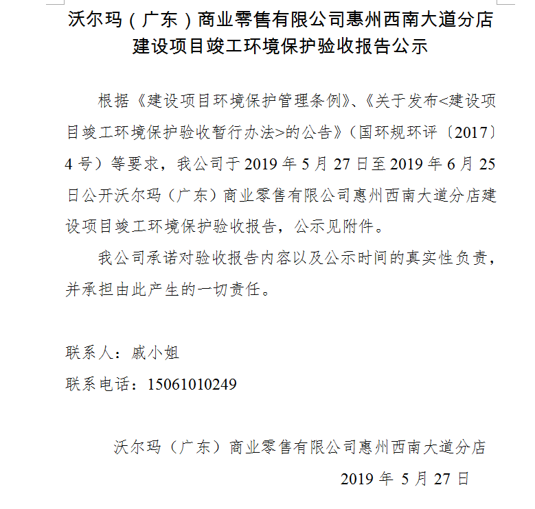 沃爾瑪(廣東)商業(yè)零售有限公司惠州仲愷大道分店 建設(shè)項目竣工環(huán)境保護驗收報告公示
